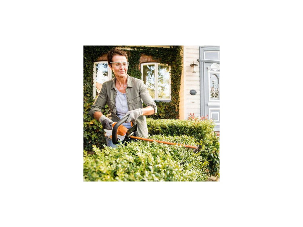 Efektivní řez zajišťuje jednostranně broušený nůž, který je navíc chráněn šroubovacím vodicím krytem při práci v blízkosti země. Pro bezpečnost je integrovaná ochrana proti pořezání a obouruční ovládání, které podporuje bezpečnou práci. Měkká rukojeť s ovládací pákou zajišťuje pohodlné držení a manipulaci.